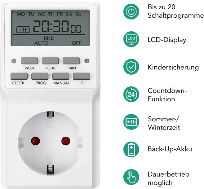 • Bezproblemowa oszczędność energii: Pomaga oszczędzać energię i pieniądze, niezawodnie wyłączając lampy i inne urządzenia. Pozwala lepiej kontrolować koszty i efektywniej wykorzystywać czas.