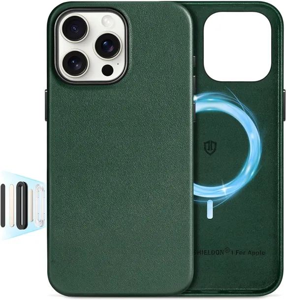 SHIELDON Etui do iPhone 16 Pro Max 6,9", Prawdziwa skóra etui z magnetycznym ładowaniem bezprzewodowym etui odporne na wstrząsy kompatybilne z iPhone 16 Pro Max - zimozielony